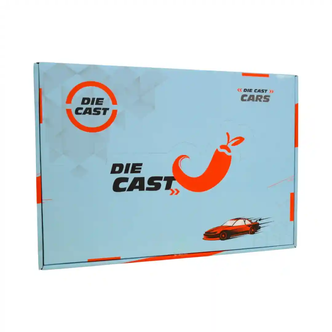 El set se ofrece en un elegante expositor de cartón con gráficos llamativos. La caja es de color azul claro y blanco, y lleva la marca «DIE CAST» en grandes letras rojas, destacando inmediatamente la calidad del material.