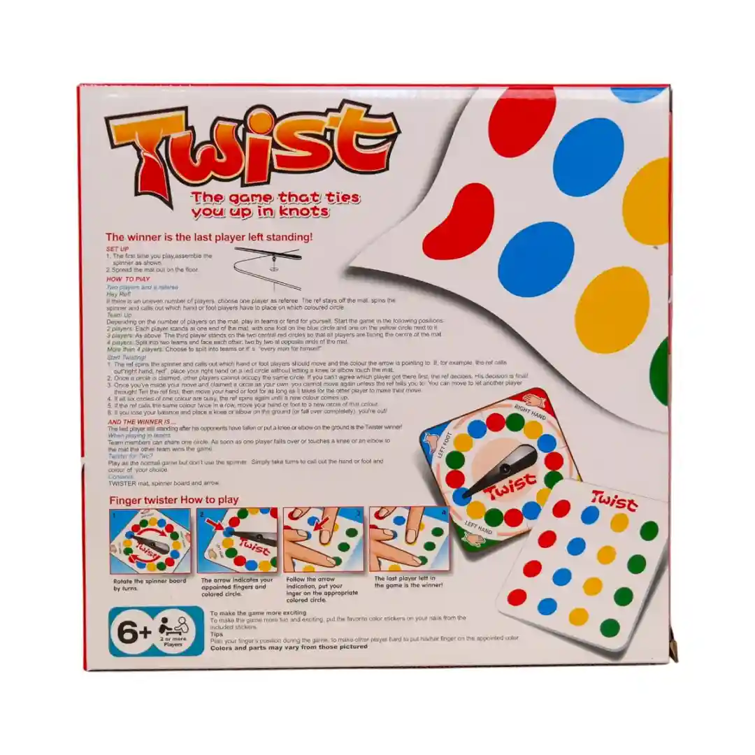 El juego se basa en una premisa simple y graciosa: seguir las instrucciones del tablero giratorio («Twister Spinner») para colocar tu mano o pie en uno de los círculos de colores del tapete, intentando mantener el equilibrio a toda costa. El ganador es «The last player left standing!» (El último jugador que quede en pie).