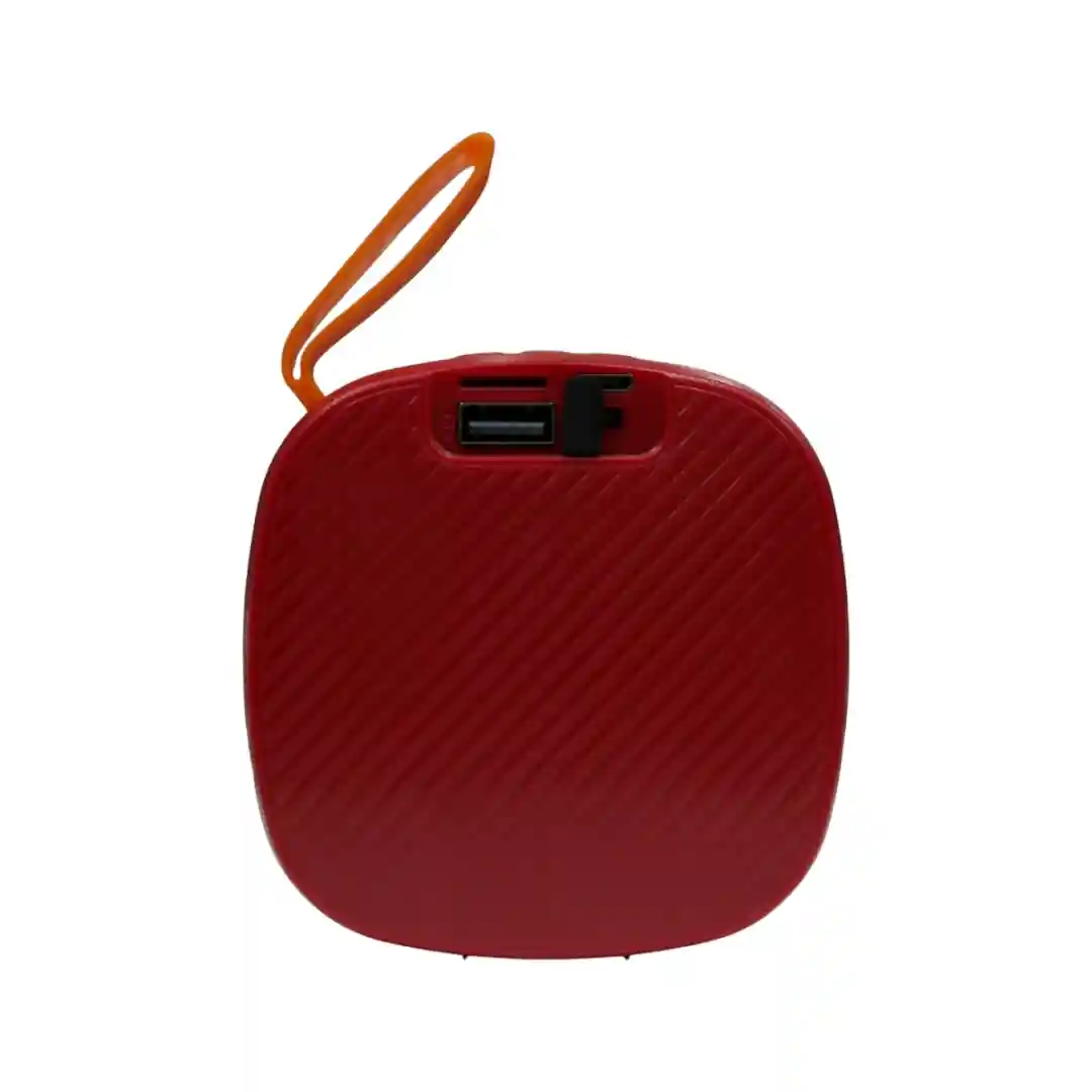Incorpora una práctica correa de sujeción, visiblemente resistente, en un color naranja fuerte que contrasta elegantemente con el cuerpo rojo. Esta asa te permite colgar el parlante de un bolso, una trabilla del pantalón o un gancho en la tienda de campaña, asegurando que la música te siga a donde vayas.