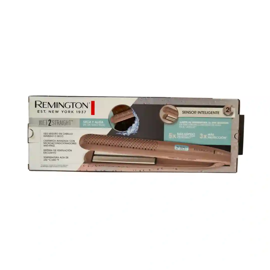 La plancha Remington Wet2Straight es una herramienta de estilizado diseñada para secar y alisar el cabello en un solo paso, optimizando el tiempo de peinado. Este sistema permite un uso seguro tanto en cabello húmedo como seco, eliminando la necesidad de secado previo con secador. Su tecnología de ventilación exclusiva protege las fibras capilares mientras transforma el cabello húmedo en un liso perfecto, ofreciendo un acabado profesional con mayor rapidez y protección.