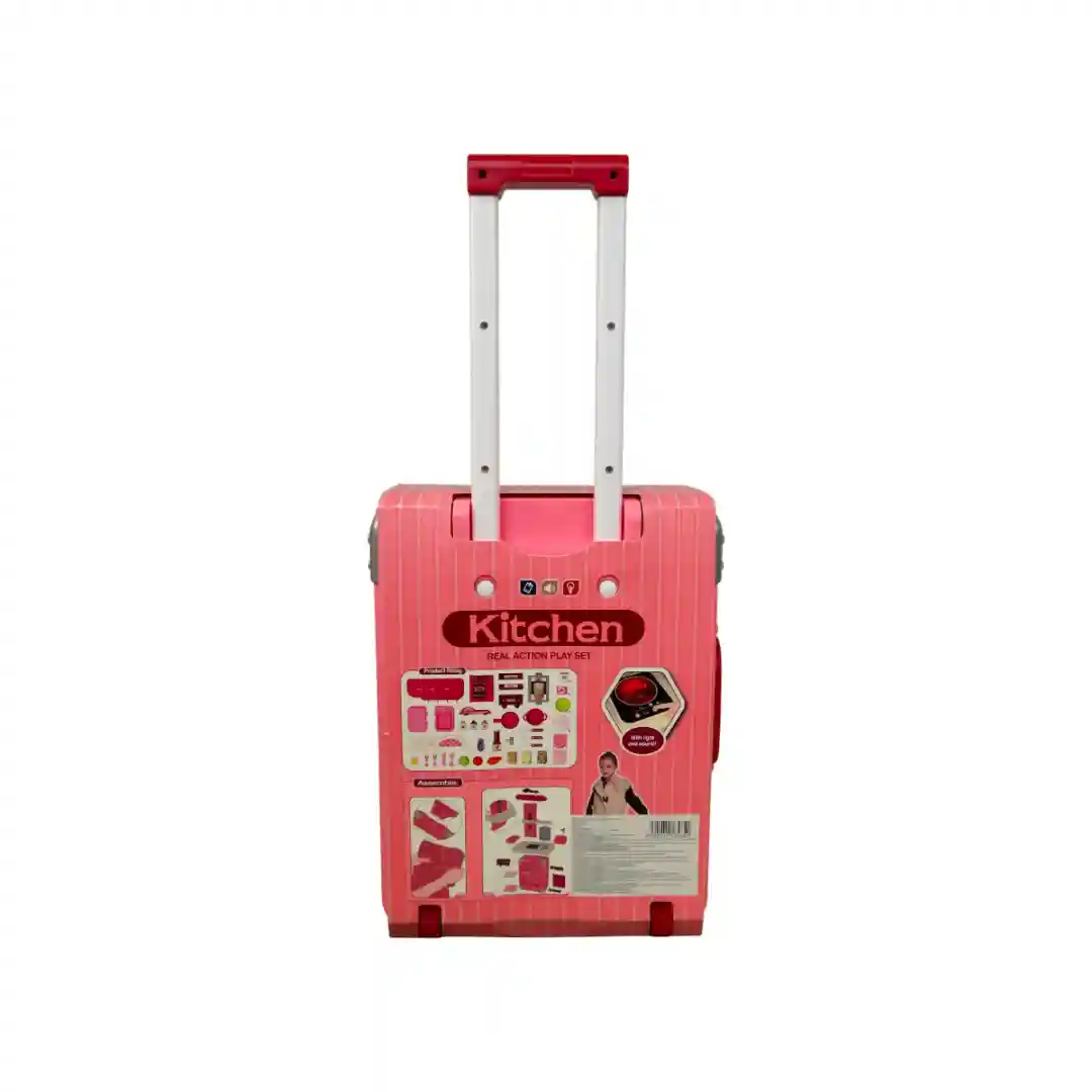 Portabilidad Genuina: Cuenta con ruedas funcionales en la base y un asa retráctil o de arrastre en la parte superior, al igual que una maleta de verdad. Esto permite a los niños arrastrar o llevar su cocina fácilmente a casa de los abuelos, amigos o al patio.