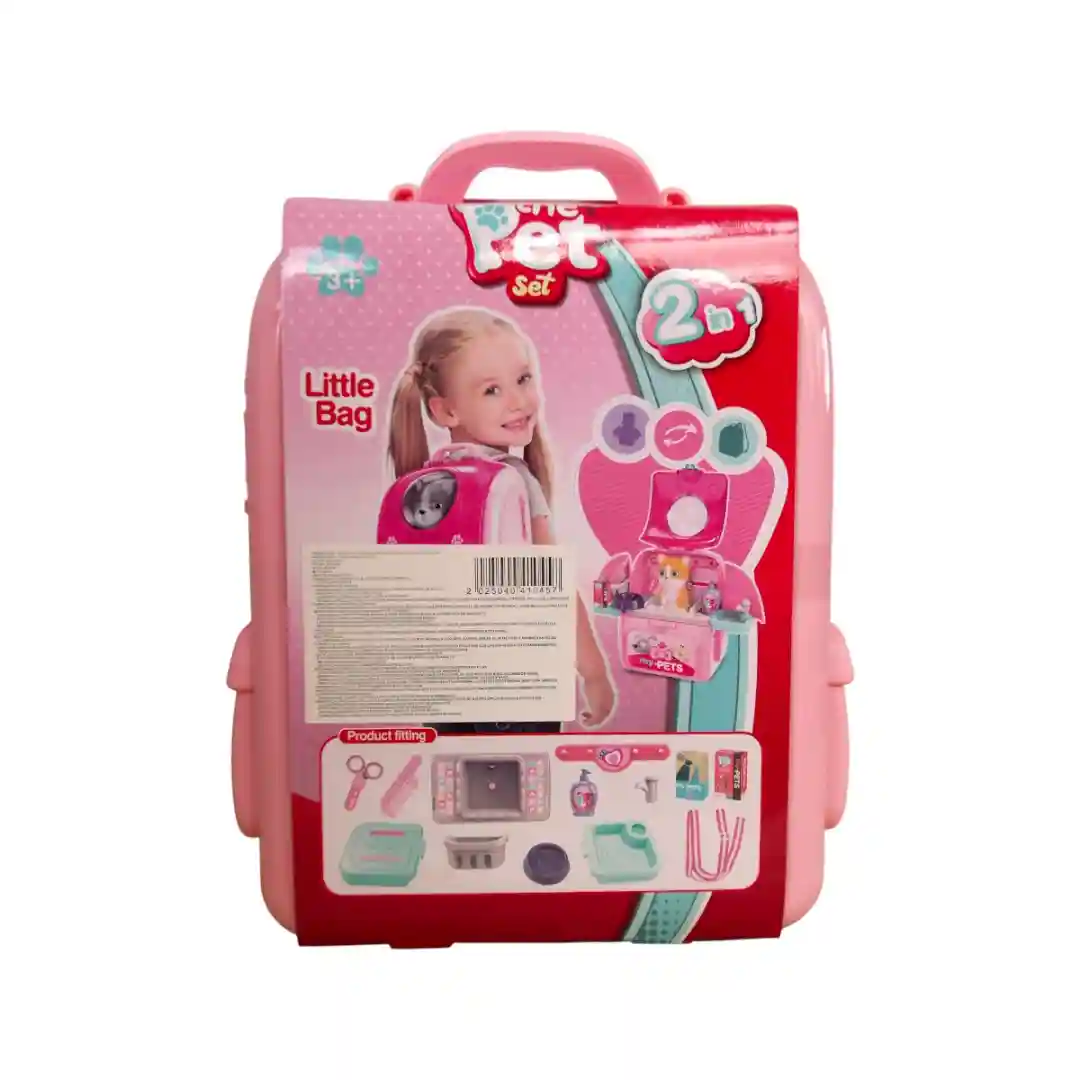 Lo que hace este set genial es su diseño 2-en-1: de ser una mochila/maleta compacta y fácil de transportar, se despliega mágicamente para convertirse en un escenario de cuidado de mascotas. La maleta tiene un asa de transporte y correas que permiten llevarla como mochila. Una vez abierta, revela todos los accesorios necesarios para una revisión veterinaria o simplemente para darle un cariñito a la mascota incluida.